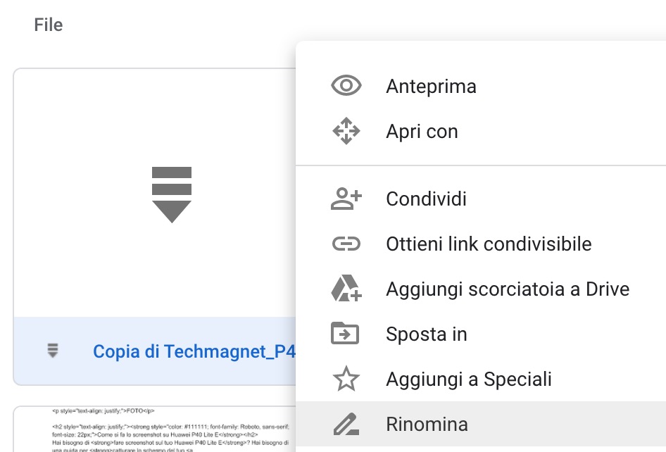 - fatto questo, scorri verso il basso la pagina di Google Drive (dove ci sono i file) e troverai la copia del file appena creata. Cliccaci sopra col destro del mouse e seleziona RINOMINA