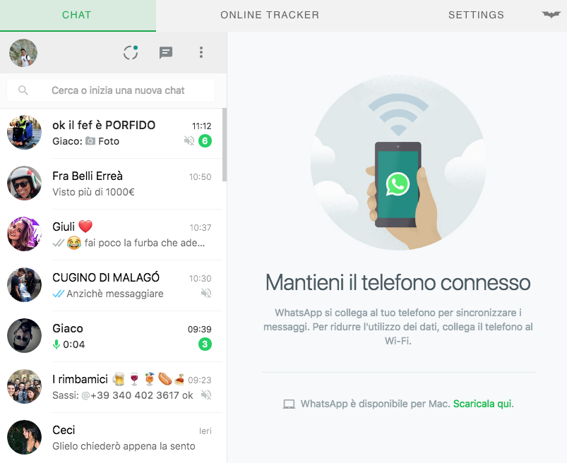 - si aprirà la finestra con le chat di WhatsApp sul tuo computer. Potrai notare che è suddivisa in 3 parti: a sinistra ci sono tutte le chat di WhatsApp, al centro l'online tracker per WhatsApp, a destra le impostazioni dell'app