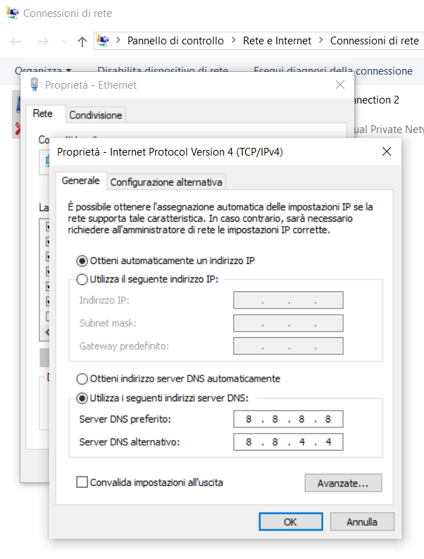 6) Premete "Utilizza i seguenti indirizzi server DNS" e scrivete nella prima fila: 8.8.8.8 e nella seconda 8.8.4.4. Quindi salvate con Ok.