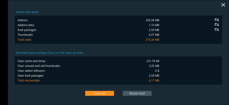 L'interfaccia non include solo il potente bottone "Clear all!", ma anche un comando per riavviare Kodi rapidamente, una chicca per l'utente esperto.