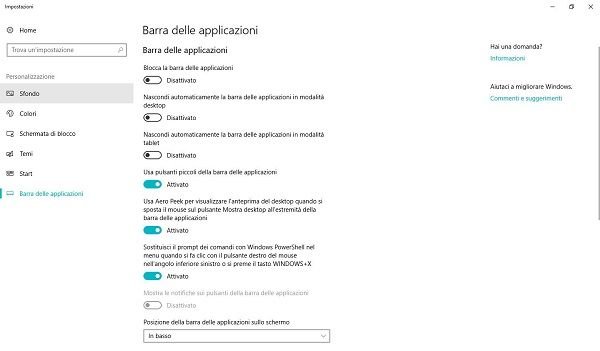 Funzioni personalizzazione Barra applicazioni Windows 10