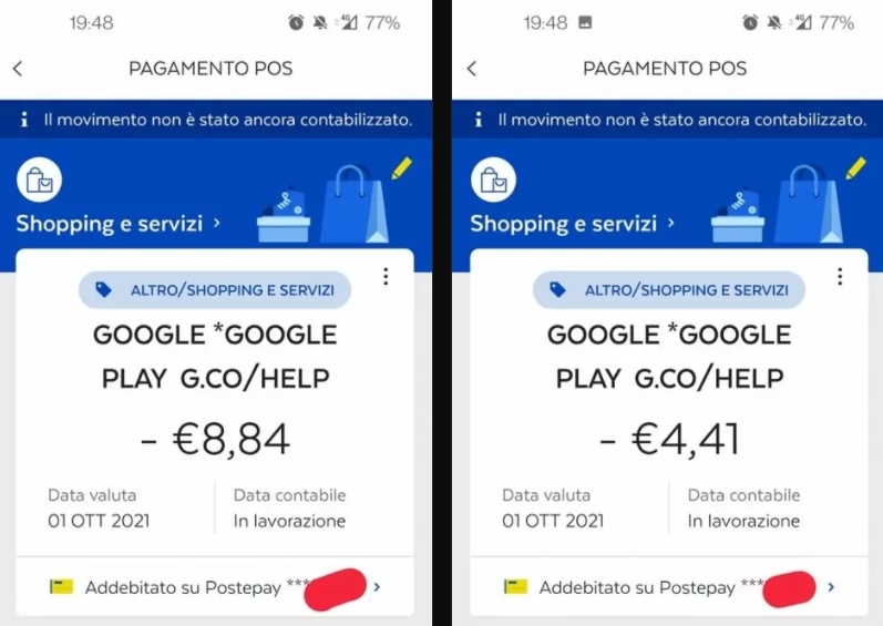 Questi pagamenti compaiono sotto la dicitura “altro/shopping e servizi” e le somme si aggirano attorno a cifre che vanno dai 4 agli 8 euro. Nello specifico, il valore di ogni transizione non autorizzata sulla propria Postepay può andare da -4,41 euro a -8,84 euro.