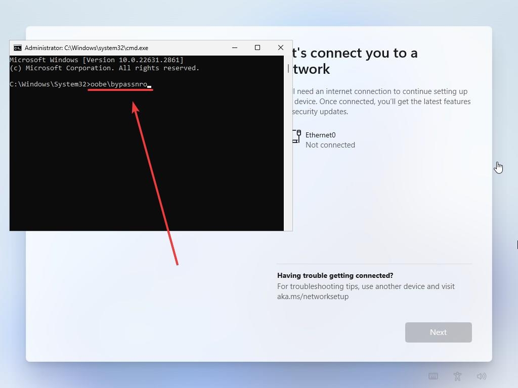 Quando ti sarà richiesto di collegarti ad una rete internet, premi Shift + F10 INSIEME per aprire il command prompt. Quando compare, digita questa stringa:
