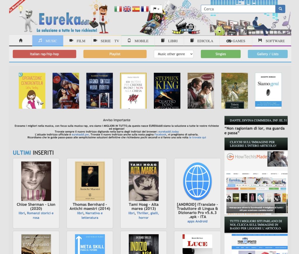 - EUREKAddl – per quanto riguarda libri in lingua italiana è uno dei migliori. Ti basterà andare sul sito, fare una ricerca e in pochi click troverai tutti i libri in PDF o EPUB che ti interessano. Peccato solo che i siti siano caricati su vari siti di file hosting esterni, che spesso propongono molta pubblicità o rendono i download un pò difficoltosi, facendo scaricare a volte programmi indesiderati. Basta comunque aprire gli occhi e fare un pò di attenzione per arrivare al download del libro di tuo interesse