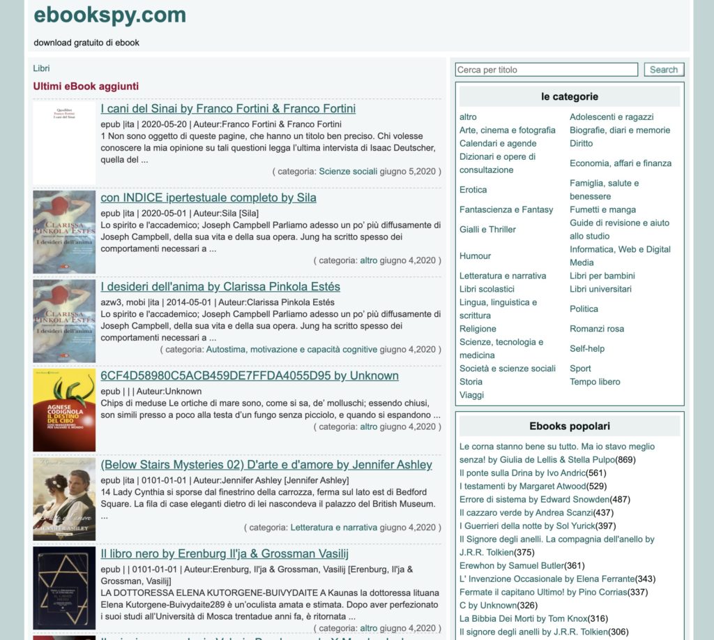 - EBOOKSPY (Ebookspy NUOVO INDIRIZZO Aggiornato Oggi): come il precedente, da provare se dopo varie ricerche non hai ancora trovato il libro che ti interessa