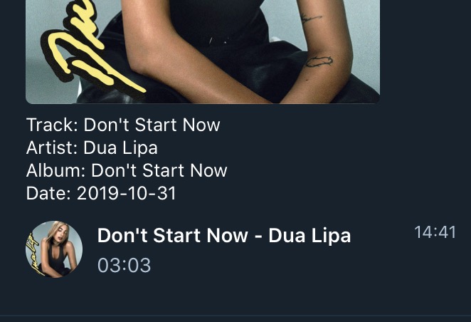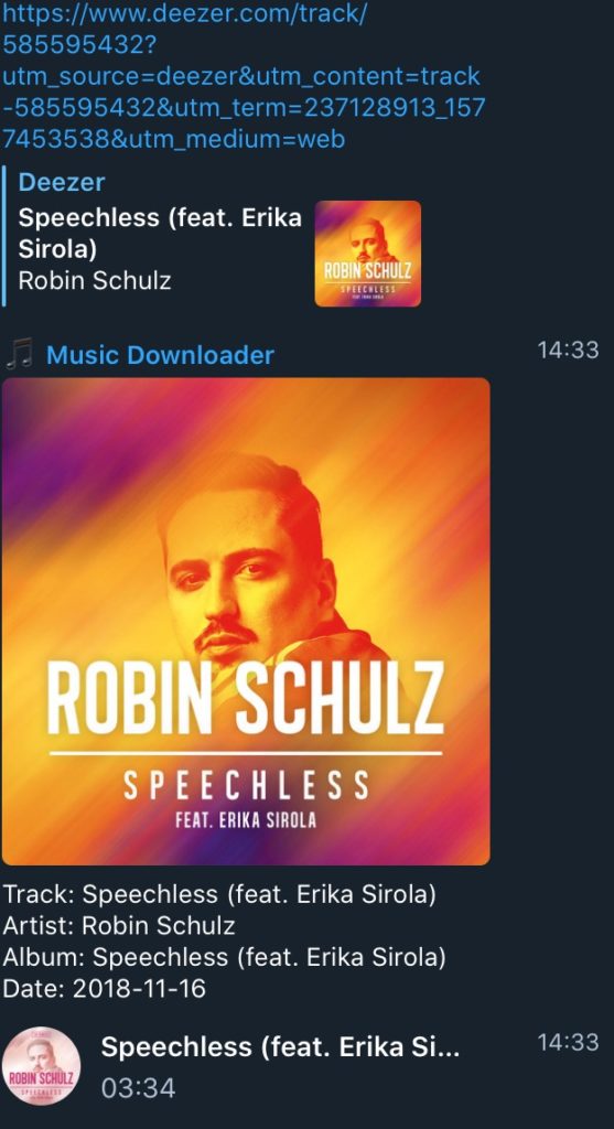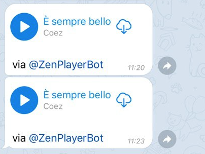 - in automatico, dopo un istante, il bot ti restituisce la copertina del brano e il link per ascoltarlo in streaming online o per scaricarlo