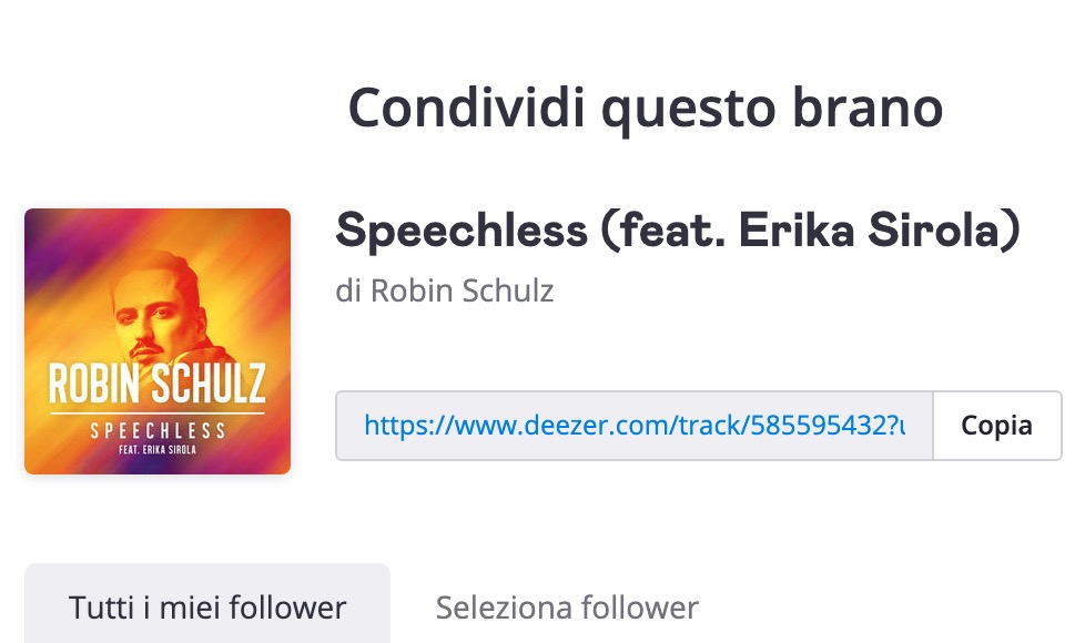 - una volta trovata la canzone, devi copiare il suo link come da immagine. Alla fine dovrai ottenere qualcosa di questo tipo per Spotify “https://open.spotify.com/track/1CRy08G60mS5jvhB27xMpS” e qualcosa di questo tipo per Deezer “https://www.deezer.com/track/585595432?utm_source=deezer&utm_content=track-585595432&utm_term=237128913_1577453538&utm_medium=web”