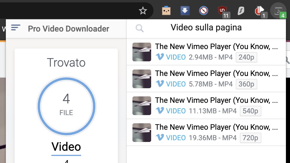 NOTA: questa icona si riferisce all'addon "Pro Video Downloader" per Chrome. L'icona potrebbe cambiare in base all'estensione che utilizzi, il procedimento invece resta uguale per tutte le estensioni.