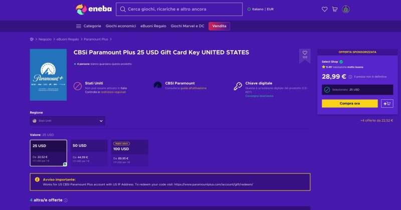 A questo punto dobbiamo acquistare una gift card Paramount Plus che ci servirà per pagare l'abbonamento.
