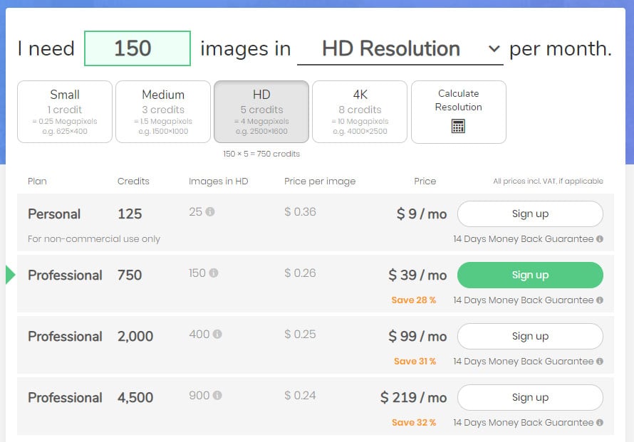 Il piano gratuito consente di elaborare gratuitamente 50 immagini di piccole dimensioni (fino a 0,25 megapixel, ad es. 625 × 400) ogni mese. Effettivamente si tratta di una risoluzione molto bassa, ma se hai esigenze particolari puoi acquistare il piano a pagamento, comunque piuttosto economico.