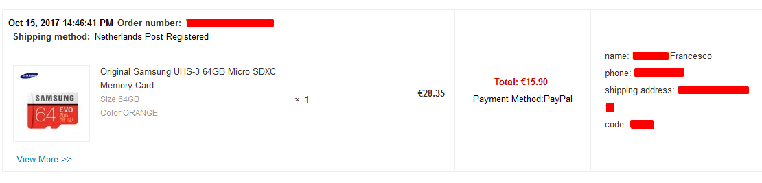 Acquistiamo una memory card microSD da 64GB Samsung in promozione, dallo store Internazionale al costo di circa 15 euro compresa la spedizione Netherlands Registered, perchè la Italy Express non era disponibile, che prevede l'arrivo della mia memoria in 15-28 giorni lavorativi, quindi dovrei riceverla tra la prima settimana di Novembre ed entro il 24 Novembre 2017.