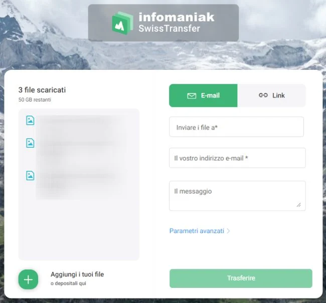 - possiamo scegliere se farlo inserendo direttamente la sua mail su Swisstransfer (come su WeTransfer) o se utilizzare un link (che poi dovremo girare a nostra volta via mail al destinatario per effettuare il download)