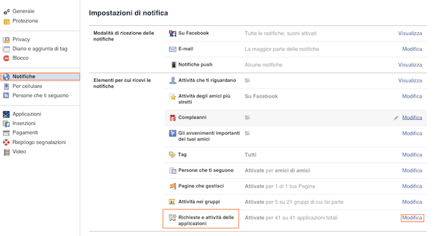 Dal menù a sinistra selezionate la voce “Notifiche”. Vi apparirà una schermata, ricercate la voce “Richieste e attività delle applicazioni” e quindi cliccate su modifica.