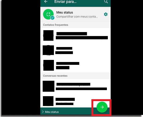 - si aprirà una nuova pagina dove potrai personalizzare l'aspetto finale dello Stato, come ad esempio le dimensioni del carattere o il colore dello sfondo. Quando hai completato le modifiche e le personalizzazioni, clicca sulla freccia verde in basso per pubblicare l'aggiornamento dello Stato di WhatsApp