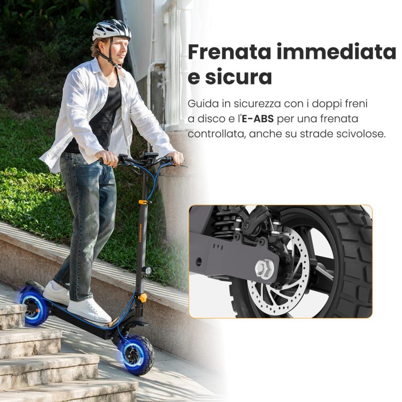 Per garantire la massima sicurezza alla guida, questo monopattino utilizza un freno elettronico E-ABS + doppio freno a disco anteriore e posteriore.