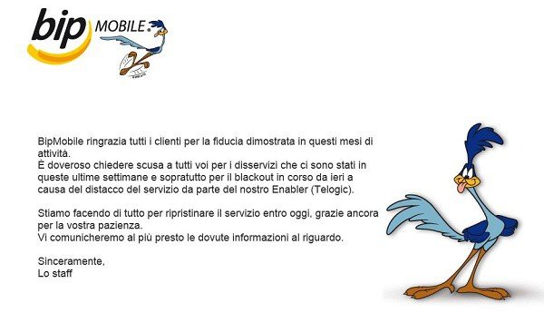 BipMobile ringrazia tutti i clienti per la fiducia dimostrata in questi mesi di attività. È doveroso chiedere scusa a tutti voi per i disservizi che ci sono stati in queste ultime settimane e sopratutto per il blackout in corso da ieri a causa del distacco del servizio da parte del nostro Enabler (Telogic). Stiamo facendo di tutto per ripristinare il servizio entro oggi, grazie ancora per la vostra pazienza. Vi comunicheremo al più presto le dovute informazioni al riguardo.