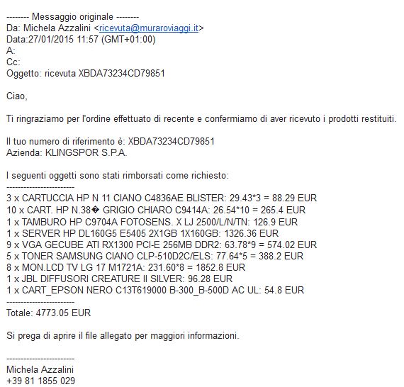 [dropcap]A[/dropcap]llerta Virus: Attenzione a tutte le vostre mail, in particolare quelle che contengono false ricevute di acquisti che voi non avete fatto. Infatti In questi giorni circola una mail che contiene al suo interno un malware (ransomware ). Il testo è semplice, il messaggio simula il rimborso di un ordine, che ovviamente non esiste, e invita il destinatario ad aprire l’allegato “per maggiori informazioni”.