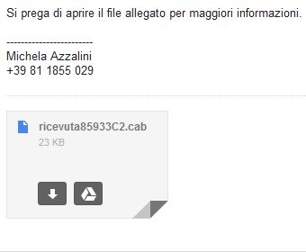 L’allegato contiene un file Cabinet che una volta aperto installa automaticamente un software ransomware che cripta parti dell’hard disk impedendone l’utilizzo.