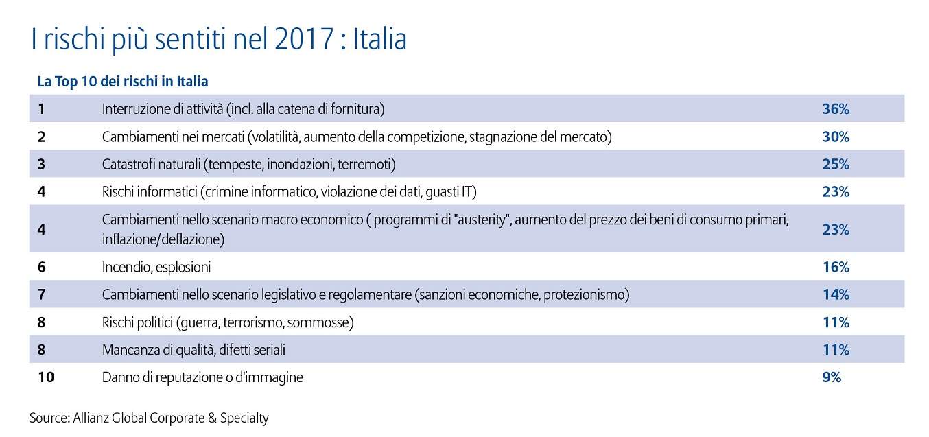 A livello globale le aziende temono sempre più l'imprevedibilità del contesto economico, laddove i mercati sono volatili (2°) e crescono i rischi politici come il protezionismo o il terrorismo. Altre preoccupazioni crescenti riguardano le nuove tecnologie e i rischi informatici (3°), ma anche le catastrofi naturali (4°). Tuttavia, a preoccupare maggiormente le aziende rimangono le perdite dovute a interruzione delle attività (1°). Sono questi i risultati dell’Allianz Risk Barometer, il 6° sondaggio annuale realizzato da Allianz Global Corporate & Specialty SE (AGCS) che analizza i rischi aziendali a livello mondiale, ma anche per area, Paese, settore e dimensione di attività. Anche in Italia i principali rischi più temuti dalle aziende sono dovuti alle interruzioni di attività (36%) e ai cambiamenti nei mercati (30%), mentre, diversamente, al terzo posto rientrano le catastrofi naturali (25%). Con il 23% seguono, a pari merito, i rischi informatici e i timori dei cambiamenti nello scenario macro economico.