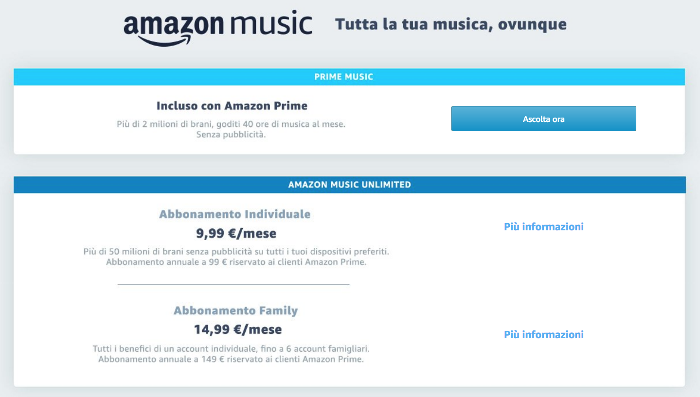 - oppure potremo passare ad Amazon Music Unlimited per eliminare ogni restrizione di tempo e sul numero di brani disponibili, acquistando un abbonamento mensile.