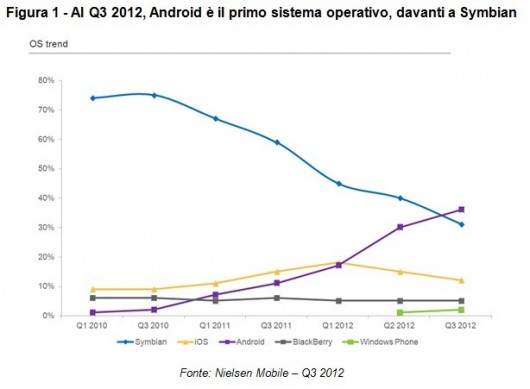 I dati Nielsen del terzo trimestre 2012 pubblicati solo pochi giorni fa indicano uno scenario ampiamente prevedibile già da parecchi mesi: Symbian non è più il sistema operativo più diffuso in Italia, ma viene soppiantato da Android, che raggiunge il 36% dell’intero mercato.