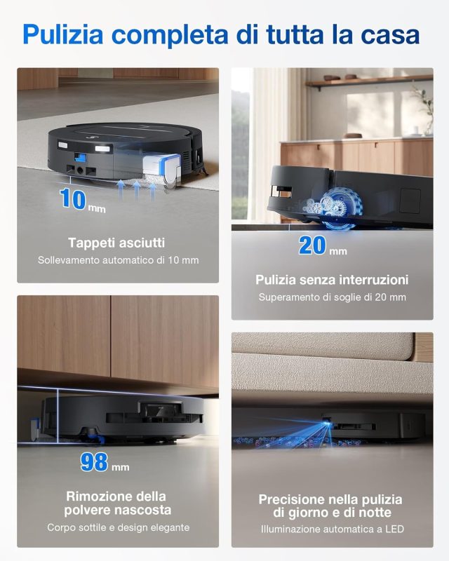 Il design sottile, con un’altezza di solo 98mm, gli consente di spostarsi sotto la maggior parte dei mobili e, grazie alla capacità di attraversare barriere fino a 20mm di altezza, è in grado di pulire diverse stanze in una volta sola.