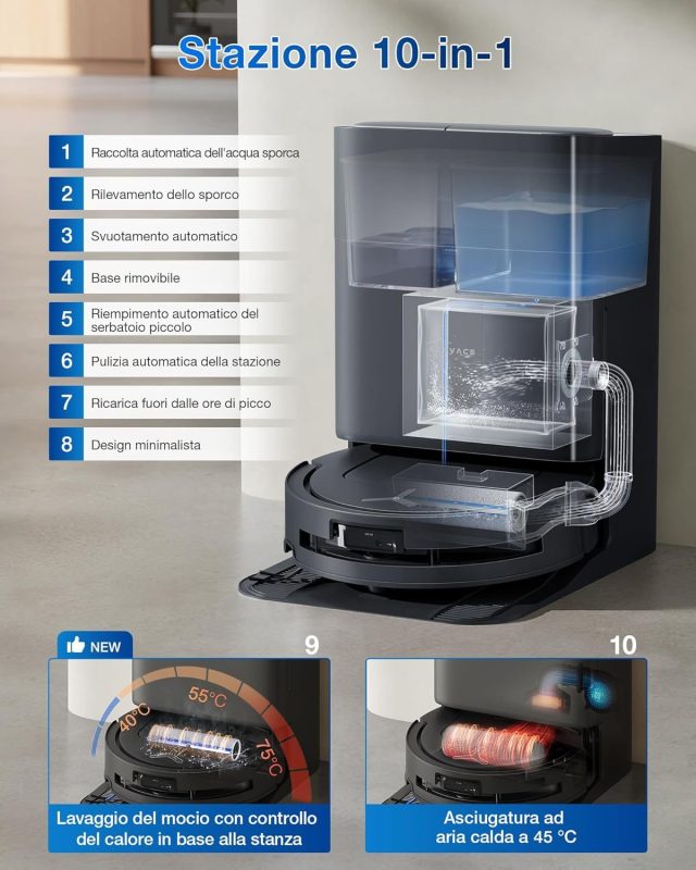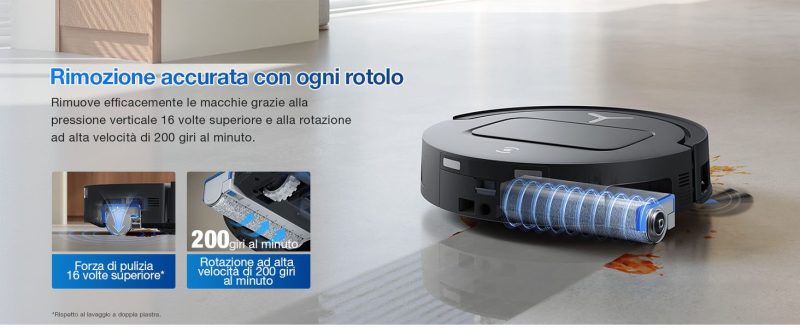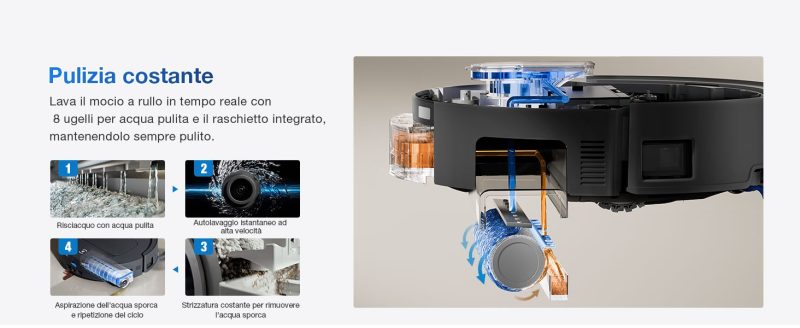 Per le macchie leggere, il robot può fare affidamento sulla sua capacità di autolavaggio istantaneo per rimuoverle sul posto senza dover tornare per un lavaggio completo.