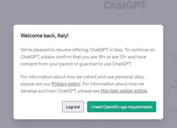 Ricordo che il Garante aveva disposto il blocco provvisorio di ChatGPT in Italia per non aver fornito un'informativa chiara e trasparente sulle modalità di raccolta e conservazione dei dati degli utenti, utilizzati per addestrare l'algoritmo di ChatGPT.