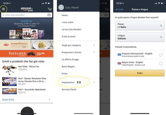 Una volta attivata la International Shopping Experience dalle Impostazioni del programma, l’app di Amazon: