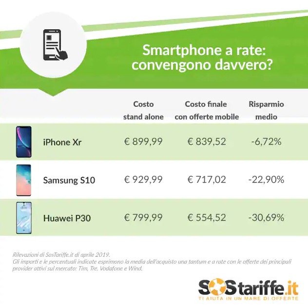 Come anticipato, questa affermazione arriva direttamente dall’ultimo osservatorio di SosTariffe.it, il quale ha ha analizzato i prezzi delle offerte degli operatori per “3 tra gli smartphone più richiesti”, ovvero iPhone XR, Samsung S10 e Huawei P30.