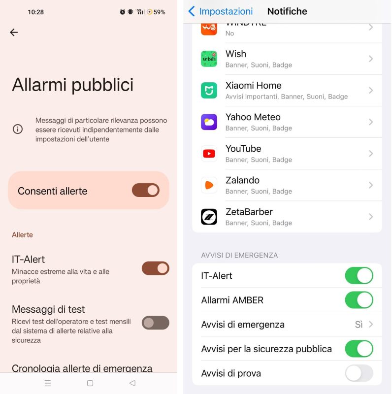Qui, sotto Avvisi di emergenza, puoi disattivare il pulsante di fianco a IT-Alert.
