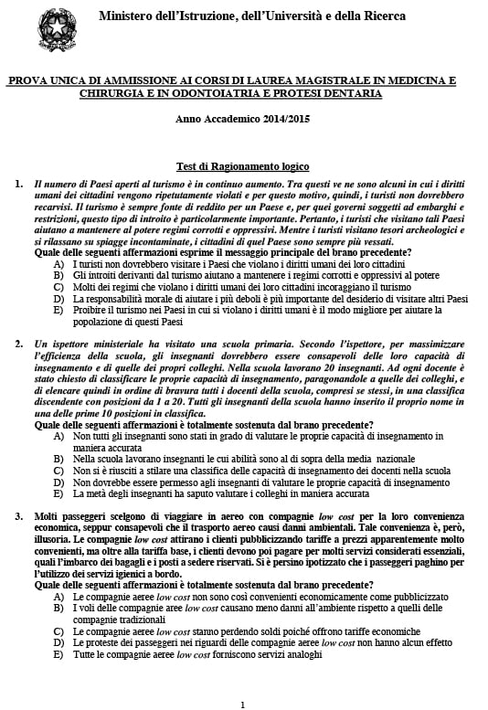 Ecco le domande e le risposte della prova unica di ammissione anche se è emerso il sospetto di presunta manomissione, il ministero conferma che non sarà annullata dopo il caso del plico mancante a Bari.