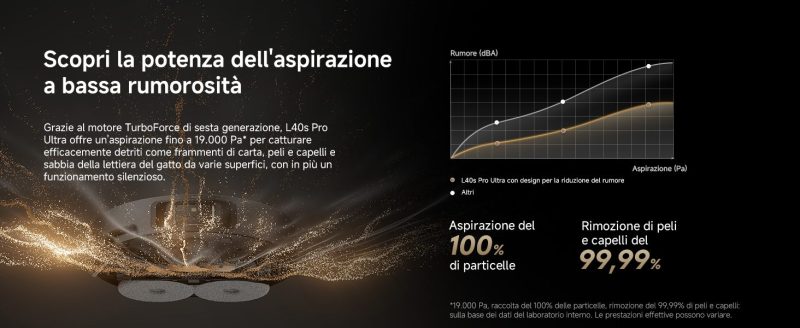 Una delle principali novità di DREAME L40S Pro Ultra è rappresentata dalla potenza di aspirazione, che passa da 11.000 Pa di L40 Ultra ai 19.000 Pa del nuovo modello.