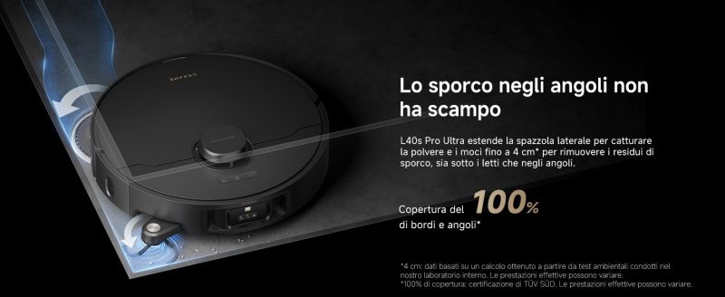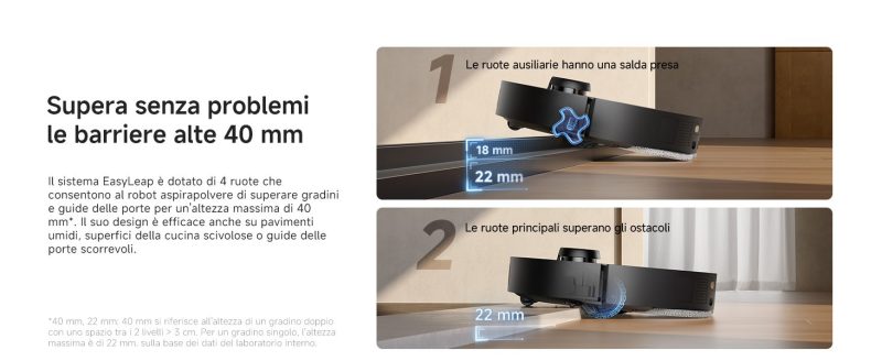 Per finire, su DREAME L40S Pro Ultra troviamo il nuovo sistema EasyLeap per le ruote, che permette al robot di superare ostacoli e dislivelli fino a 4 cm.