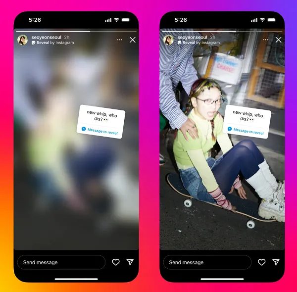 - Quando selezioni l'adesivo Rivela, ti viene chiesto di digitare un indizio per gli amici su quello che vedranno rivelando la Storia sfocata.