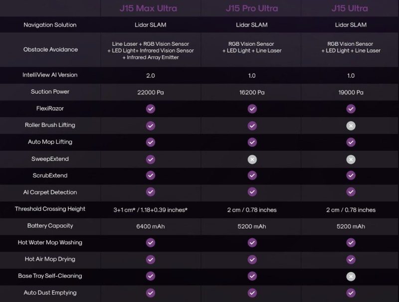 Differenze fra Eureka J15 Max Ultra, J15 Pro Ultra e J15 Ultra