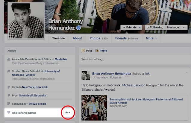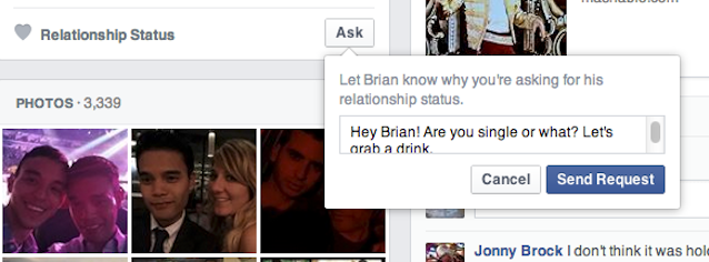 Come abbiamo detto, presto tutti gli utenti di Facebook che utilizzano il social network per flirtare potranno sfruttare una nuova arma molto potente: il colosso di Menlo Park ha infatti dato il via al rollout di una funzionalità che semplificherà il “primo approccio” grazie all’introduzione della possibilità di chiedere la situazione sentimentale agli utenti che non lo hanno specificato nelle informazioni del proprio profilo.