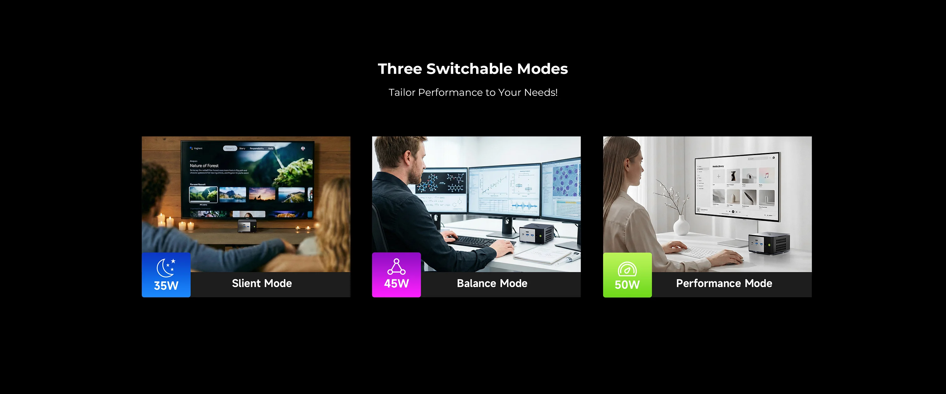 Il mini PC offre 3 modalità operative per adattarsi a diversi scenari d'uso: