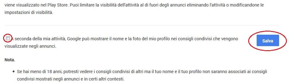Per disattivare questa opzione vi basterà andare in questa pagina (Consigli condivisi) dopo aver effettuato l'accesso a Google Plus scorrere fino in fondo e disattivare la voce “A seconda della mia attività, Google può mostrare…”. L’impostazione, va ribadito, influisce solo sugli annunci e non disabilita la comparsa dei propri dati in altri prodotti Google proprio come l'immagine seguente.