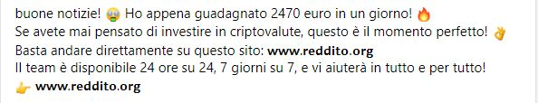 Il messaggio truffaldino legato al sito di investimenti Reddito.org
