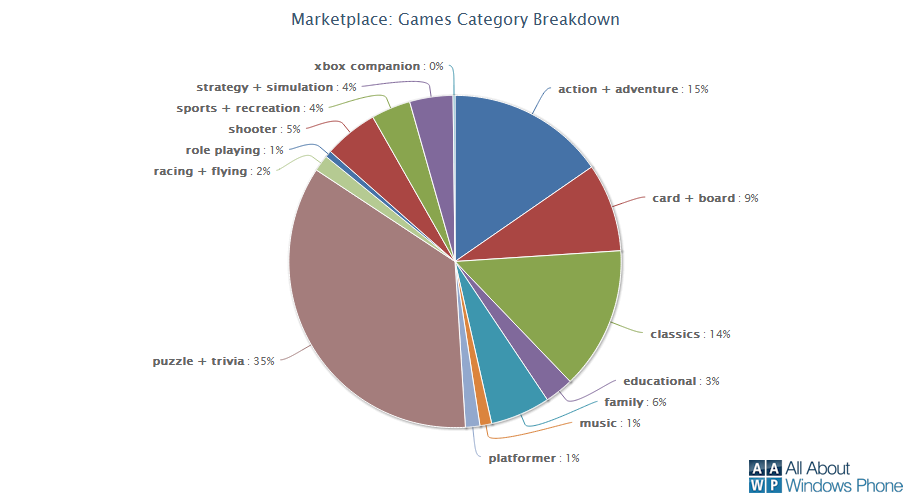 Per quanto riguarda i giochi, settore da non sottovalutare in un periodo nel quale Microsoft insieme a Nokia ha intenzione di aggredire le fasce più giovani del mercato, possiamo notare come la categoria dei puzzle (35%) sia la maggior rappresentata, davanti agli action (15%) ed ai classici (14%).