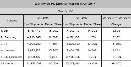 Dell si riconferma primo produttore al mondo di monitor per pc. Il 2014 è stato un anno non buono per le vendite di questa categoria di prodotti con un calo di vendite generali ma Dell è rimasta comunque leader del settore bissando il titolo ricevuto lo scorso anno.
