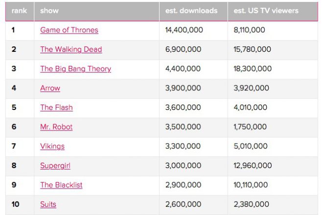 Anche quest'anno Il Trono di Spade vince la ben poco gratificante classifica dei serial più scaricati (illegalmente), staccando di gran lunga la seconda in classifica: The Walking Dead.