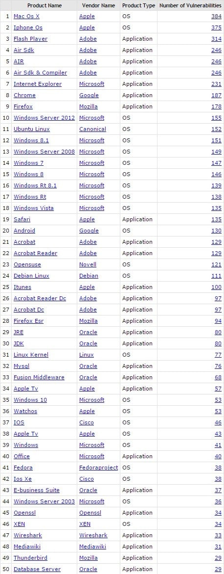 Come anticipato, dal report su quali siano i singoli software più bucati nel 2015 nasce una classifica sorprendente: al primo e al secondo posto si trovano prodotti Apple! Si, avete capito bene: tra i software più vulnerabili e bucati del 2015 troviamo i 2 sistemi operativi di Apple, quello per computer fissi/portatili e quello per smartphone e tablet. Ma i sistemi operativi di Apple non erano quelli più sicuri di sempre, che non potevano prendere nemmeno i virus?