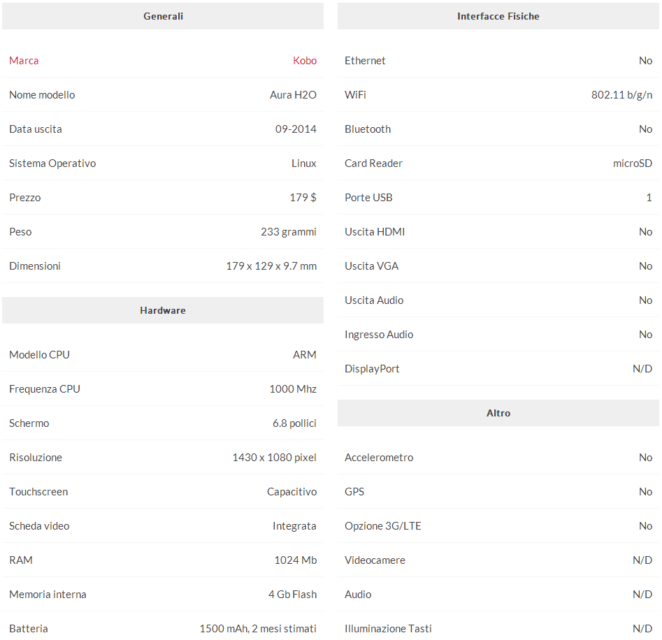 Kobo Aura H2O è il primo eReader con display E-Ink Carta da 6.8 pollici, ha risoluzione di 1430 x 1080 pixel, 4 GB di memoria interna, CPU Freescale Cortex-A9 a 1 Ghz, illuminazione ComfortLight, lettore microSD e 2 mesi di autonomia.