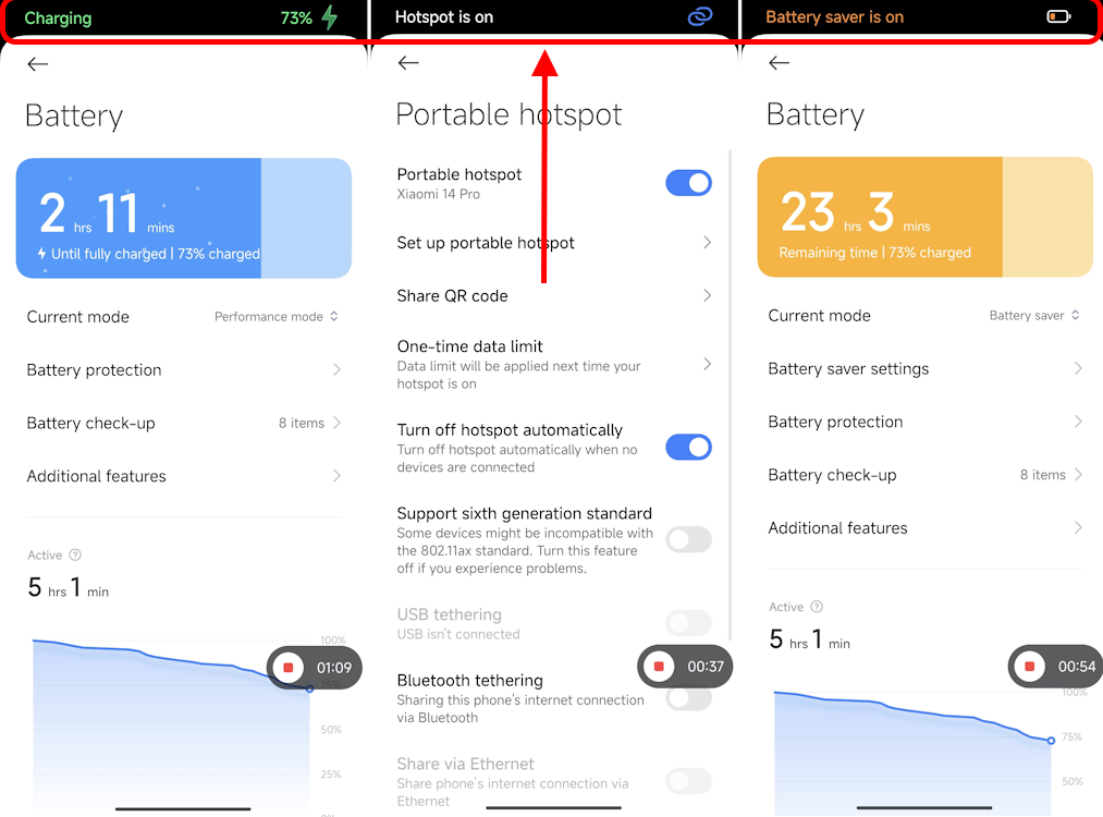 Sinceramente non penso che sia una funzione utilissima, ma è comunque corretto segnalare che ora, nella parte alta dello schermo, compare una piccola barra di notifica quando mettiamo lo smartphone in carica, attiviamo il risparmio energetico o la modalità silenziosa o attiviamo l'hotspot.