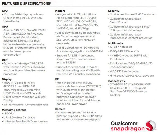 Lo Snapdragon 820 supporta inoltre la funzione QuickCharge 3.0, USB 3.0 e molte funzioni aggiuntive.