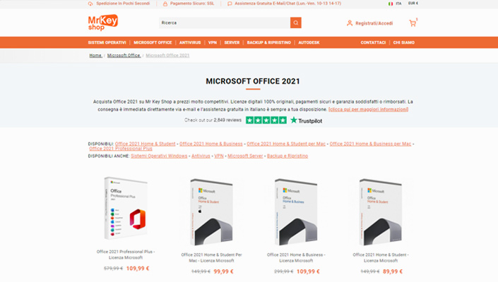 Oltre a Office 2021, Mr Key Shop offre altre versioni di Office per Mac e Pc, sistemi operativi Windows, antivirus, VPN, software di backup e ripristino, Autocad e Windows Server.