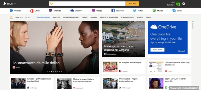 Il nuovo sito MSN dunque includerà un link direto per accedere ai numerosi servizi Microsoft ed una maggiore integrazione con i social network più diffusi. Infatti sulla parte superiore del sito è presente una barra multifunzione che permetterà di accedere ai servizi Microsoft come Outlook, OneDrive, Office, OneNote e Mappe ma anche di accedere a Facebook, Twitter e senza dimenticare il servizio musicale di Xbox ed ovviamente l'integrazione con Skype.