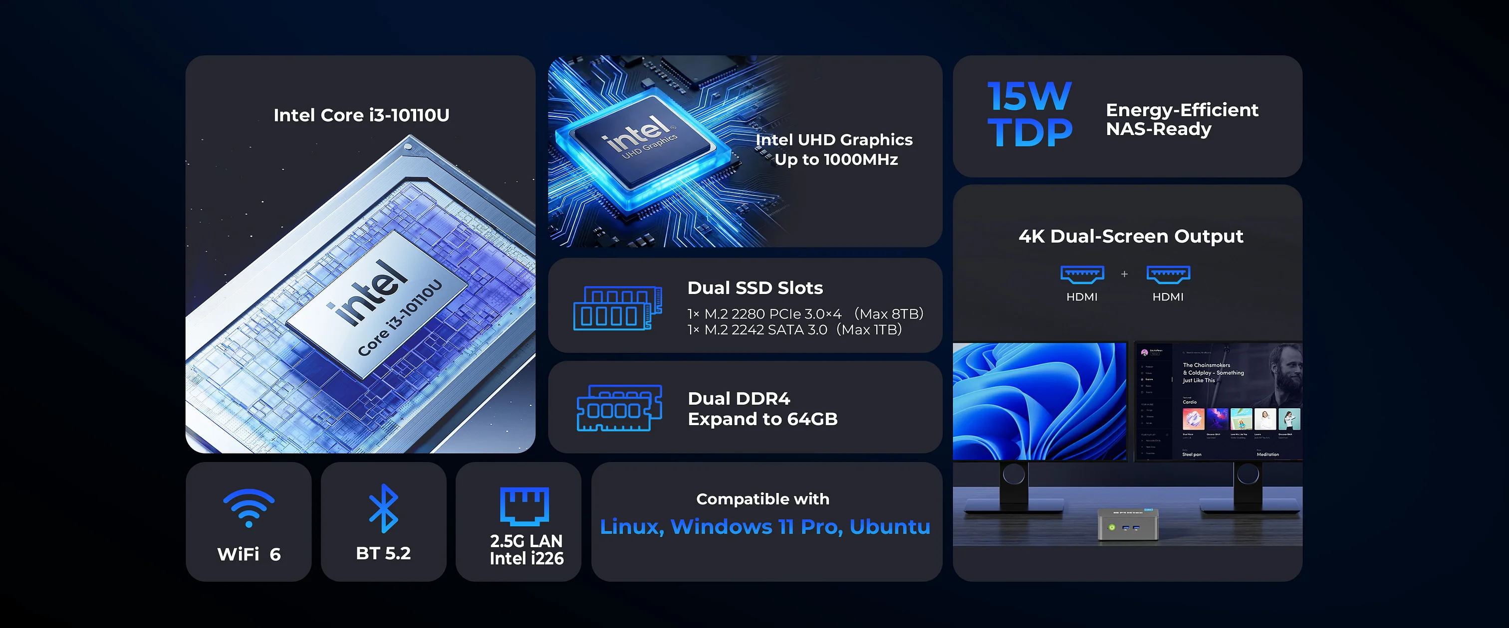 Questo mini PC compatto integra un Intel Core i3-10110U (Comet Lake), CPU mobile di decima generazione lanciata nel 2019. Una scelta meno recente, ma che offre ancora oggi caratteristiche interessanti — soprattutto in termini di prestazioni single-core ed espandibilità.